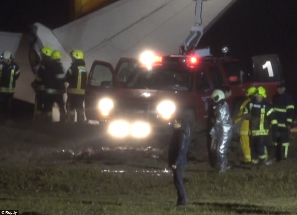 Khói cũng bốc lên cuồn cuộn từ cabin, trong khi dịch vụ cứu hỏa nhanh chóng có mặt để dập lửa bằng các vòi nước.