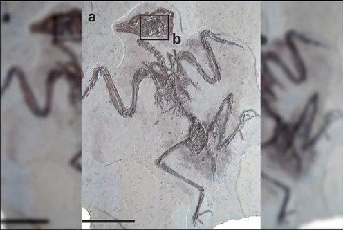 Mẫu hóa thạch chim cổ đại được tìm thấy ở Liêu Ninh (Trung Quốc). Ô vuông màu đen cho thấy vị trí hóa thạch mắt gần như còn nguyên vẹn sau 120 triệu năm