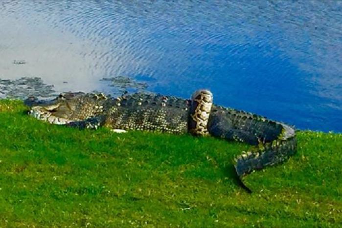 Hai con vật trong một trận chiến không phân thắng bại tại sân golf ở Naples, Florida. Con trăn dù bị cá sấu ngậm chặt đầu. Thế nhưng con trăn vẫn quấn chặt lấy con cá sấu.