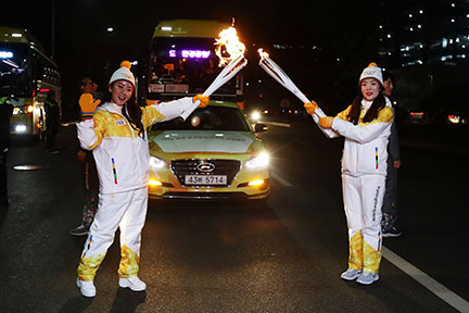 Hai nữ thể tháo gia Nam Hàn đang dự lễ chuyền đuốc Thế Vận Hội Mùa Đông 2018 PyeongChang tại thủ đô Seoul ngày thứ Ba, 16 tháng Giêng. Bắc Hàn đã đồng ý thành lập một đội hockey nữ chung với Nam Hàn, đại diện cho Triều Tiên tại Thế Vận Hội sắp diễn ra trong tháng Hai tại Nam Hàn. (Chung Sung-Jun/ Getty Images)