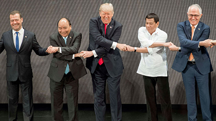 Ông Donald Trump giữa các lãnh đạo từ trái là thủ tướng Nga, thủ tướng CSVN, thủ tướng Phi Luật Tân và thủ tướng Úc tại hội nghị thượng đỉnh ASEAN ở Manila ngày 13 tháng 11, 2017. (Getty Images)