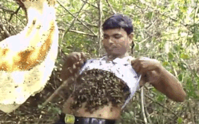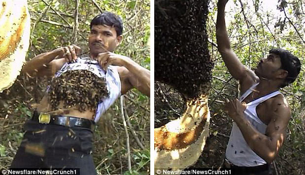 Vietbf.com - Một người đàn ông làm nghề thu hoạch mật ong khoảng 15 năm cần mẫn với nghề, trong khi mgười đàn ông này bốc hàng trăm con ong nhét vào trong áo để thu mật, khiến sự việc không phải ngẫu nhiên mà có khả năng này, vì kiên trì tự tin trở nên miễn nhiễm với nọc ong.