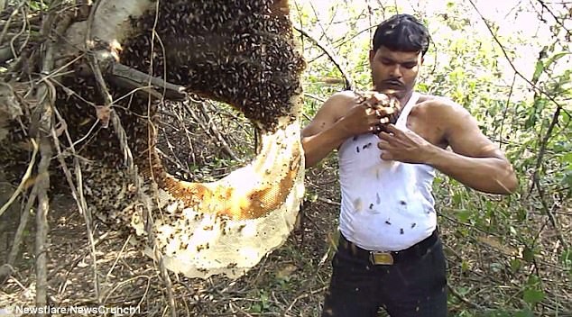 Anh Dalal, năm nay 31 tuổi, đã trở thành một người thu hoạch mật ong chuyên nghiệp trong khoảng 15 năm qua, nói rằng anh đã bị ong đốt nhiều tới nỗi cơ thể miễn nhiễm với nọc ong.