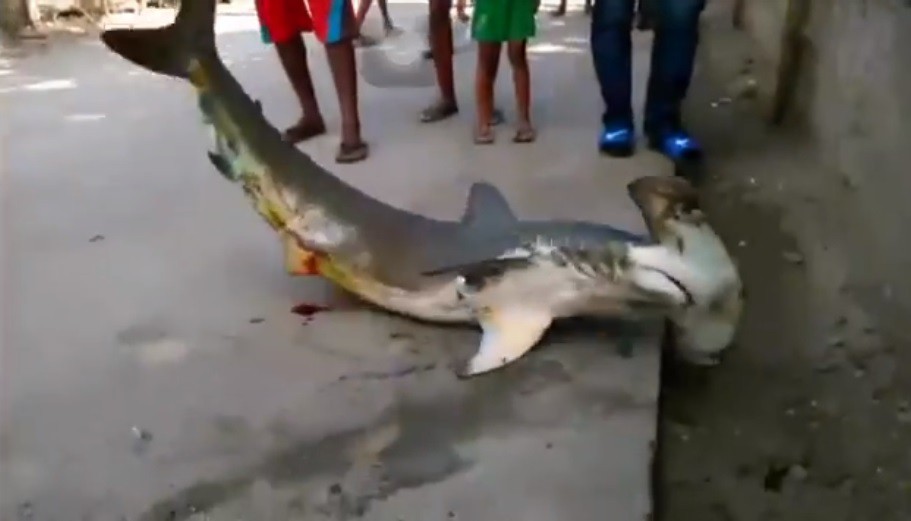 Chú cá mập đầu búa bị người dân đá giữa đường.