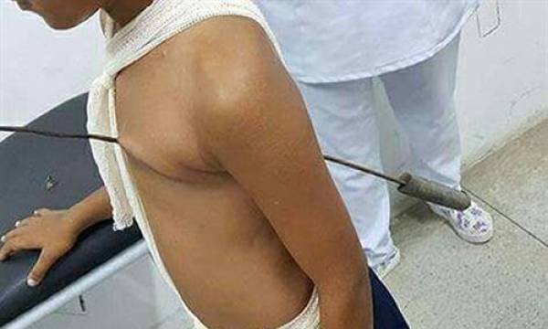 Trong lúc chơi trèo thang bên ngoài nhà ở Toritama, đông bắc Brazil ngày 18/1, Marivaldo José da Silva, 11 tuổi, ngã va vào thùng đựng xiên nướng thịt. Một thanh kim loại đâm từ phía sau qua ngực trái của Silva, theo PopCulture.