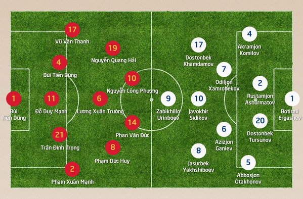 Các học trò của HLV Park Hang-seo sẽ dùng trang phục đỏ - từng sử dụng trong các trận thắng Australia và Iraq ở giải đấu trên đất Trung Quốc. Uzbekistan mặc đồ màu trắng.