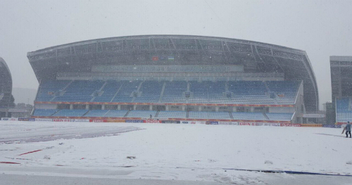 Tuyết rơi khá dày, toàn sân phủ một màu trắng, có thể trận bóng sẽ phải hủy?