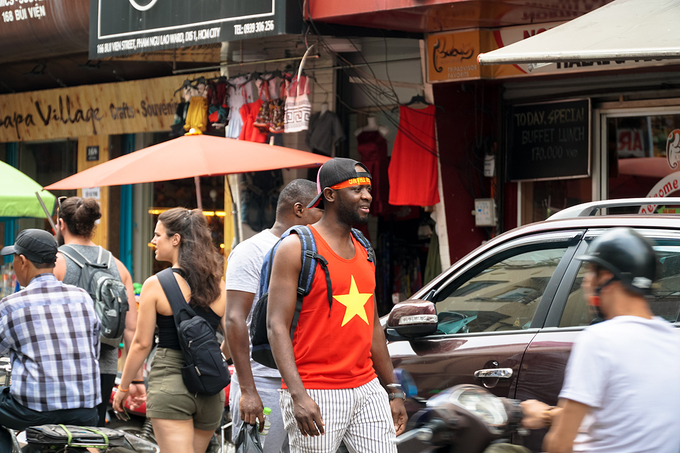 Tại phố Tây Bùi Viện, nhiều du khách đã mặc sẵn áo Việt Nam trong tâm thế sẽ ăn mừng tại đây.