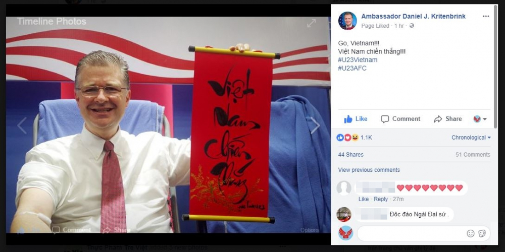 Trong ảnh, Đại sứ Kritenbrink cầm trên tay bức thư pháp với dòng chữ "Việt Nam chiến thắng" với chú thích: "Go, Vietnam!!! Việt Nam chiến thắng!!!". Chỉ sau một giờ đăng tải, bức ảnh của ông nhận được hơn 1.300 lượt thích và nhiều bình luận.