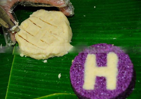 Phần đỗ xanh cũng cắt thành từng khoanh, dùng khuôn chữ để cắt chữ.