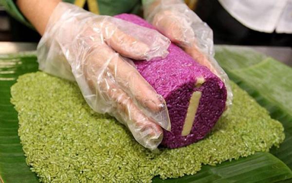 Dàn đều phần gạo nếp xào lá dứa lên lá chuối để bọc kín phần nếp cẩm in chữ
