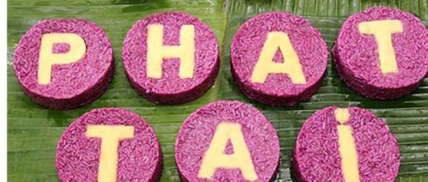 Những khoanh bánh Tét hình tròn, lớp vỏ màu nếp cẩm tím đậm, nổi bật những chữ cái bằng đậu xanh vàng óng bên trong, khi cắt ra ghép được thành những lời chúc trong dịp năm mới như Phúc, Tài, Lộc… đã mang đến một điểm nhấn riêng cho thị trường bánh chưng, bánh tét truyền thống.