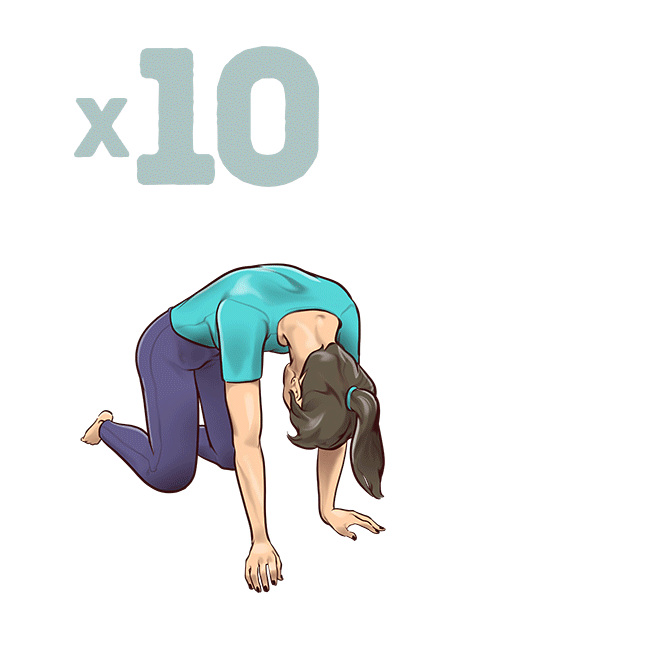 Từ từ kéo giãn lưng, gập lưng lại giống như một con mèo và hít thở sâu. Giữ nguyên tư thế khoảng 15 giây sau đó trở về tư thế ban đầu.