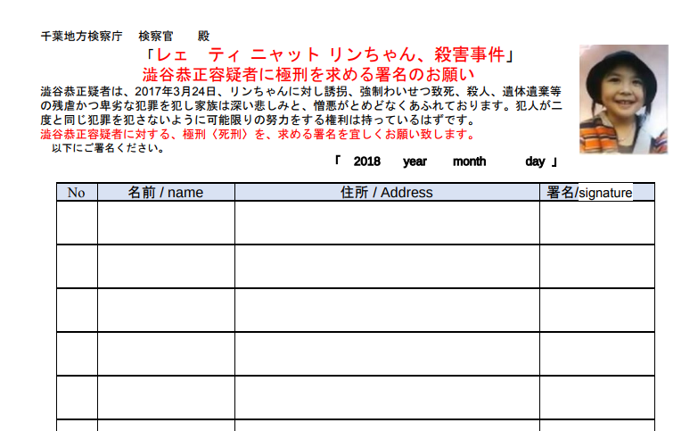 Old  Default Gia đình bé gái bị giết tại Nhật nỗ lực xin chữ ký đòi công lý cho con
