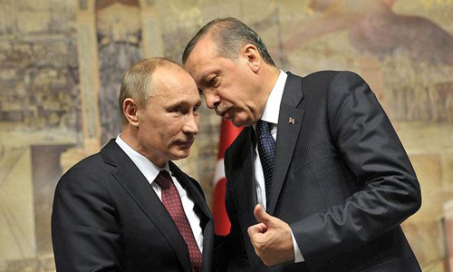 Tổng thống Nga Putin (trái) trò chuyện cùng ông Erdogan. Ảnh: Moscow Times.