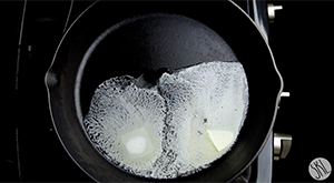 1. Dùng một chảo nhỏ. Mở bếp lửa vừa. Cho chảo lên bếp. Cho bơ nhạt vào chảo, cứ để bơ tan chảy trong chảo.