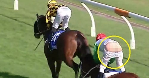 Tay đua ngựa Blake Shinn đã gặp một sự cố trang phục khó quên khi dây chun quần bị đứt khiến chiếc quần tuột xuống chân, lộ cả vòng 3 trước hàng nghìn khán giả tại giải đua Canterbury, Australia vào tháng 4/2015.