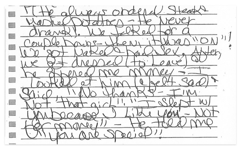 Khi McDougal mặc quần áo và chuẩn bị ra về, Trump có một hành động khiến cô ngạc nhiên. “Anh ấy cho tôi tiền”, cô viết. “Tôi nhìn anh (+ thấy buồn) + nói, ‘Không cần đâu, em không phải loại con gái đó. Em ngủ với anh vì thích anh, không phải vì tiền’ rồi anh ấy nói ‘em thật đặc biệt’”.