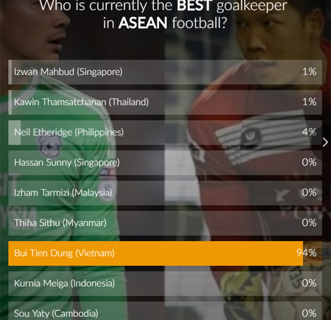 Cụ thể, Bùi Tiến Dũng đang giành được tới 94% số phiếu bầu của độc giả, bỏ xa người xếp thứ hai là thủ thành Neil Etheridge của Philippines với 4%. Thủ môn Kawin Thamsatchanan của tuyển Thái Lan chỉ nhận được 1% phiếu bầu, bằng với đồng nghiệp Izwan Mahbud của Singapore.