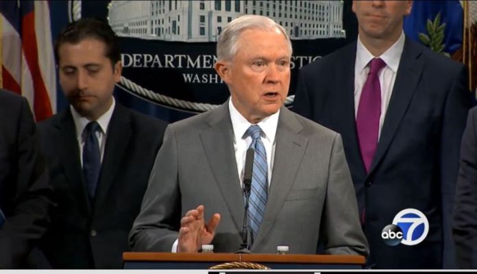 Bộ Trưởng Tư Pháp Jeff Sessions nói về tệ trạng lừa đảo giới cao niên Mỹ. (Hình ABC 7)