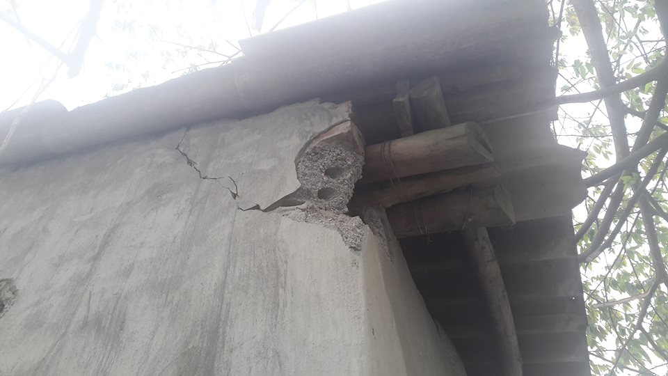 Tường nhà bị một vết lõm sâu hoắm như có đạn bắn.