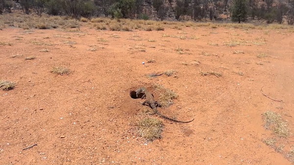 Đoạn video được ghi lại sân golf Alice Springs ở Desert Springs, Australia, cho thấy kỳ nhông chui vào hang thỏ để kiếm đồ ăn. Ngay sau đó, nó lùi ra ngoài với một con thỏ nhỏ trong miệng.
