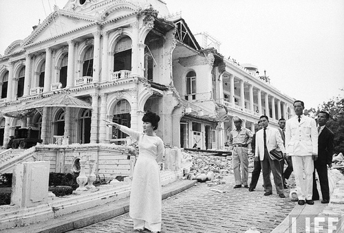 Bà Trần Lệ Xuân (vợ ông Ngô Đ́nh Nhu - cố vấn Tổng thống Ngô Đ́nh Diệm) kiểm tra dinh Norodom sau khi bị đánh bom ngày 27/2/1962. Ảnh: LIFE.