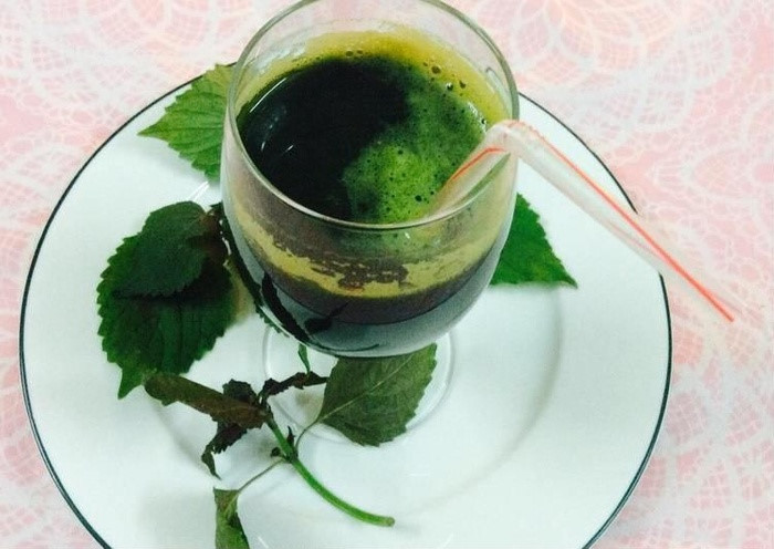 Cho lá tía tô vào máy ép lấy nước đổ vào chiếc ly, thêm nước cốt chanh, mật ong và vài viên đá vào rồi khuấy đều là có thể thưởng thức ngay.