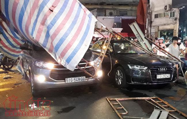 Khoảng 19 giờ 40 ngày 9/3, nhiều phương tiện lưu thông trên đường Cách Mạng Tháng 8 hướng về trung tâm quận 1, khi đang dừng chờ đèn đỏ tại vòng xoay Ngã 6 Phù Đổng (phường Bến Thành, quận 1) thì bất ngờ giàn giáo của một công trình xây dựng đổ sập, đè trúng 2 xe ô tô, nhiều người đi xe máy may mắn thoát chết bỏ chạy thoát thân.