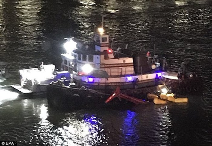 Một số nguồn tin cho biết có 5 người mắc kẹt trong máy bay khi nó rơi xuống nước, viên phi công đă thoát ra an toàn. Ảnh khoảnh khắc chiếc máy bay sắp lao xuống sông: Eric Adams.
