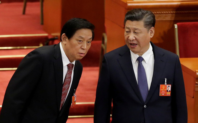 Ông Tập Cận Bình (phải) trao đổi với Ủy viên thường vụ Bộ chính trị Trung Quốc, ông Lật Chiến Thư, tại Đại lễ đường nhân dân Bắc Kinh ngày 11/3 (Ảnh: Reuters)