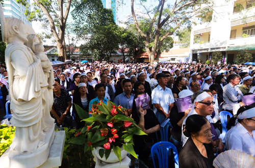 Sáng nay 17/3, hàng nghìn giáo dân tập trung về Trung tâm mục vụ của giáo phận trên đường Tôn Đức Thắng (quận 1, TP HCM) dự thánh lễ an táng Đức Tổng giám mục Phaolô Bùi Văn Đọc.
