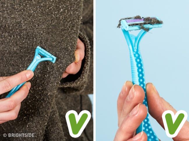 Những áo len cũ thường có rất nhiều sợi lông bị xù lên, gây mất thẩm mỹ. Muốn tiếp tục sử dụng chúng, bạn hãy sử dụng dao cạo để loại bỏ những đoạn xù trên len. Lưu ý là cạo cẩn thận nếu không là bạn sẽ phải cho nó làm giẻ lau và mua lại chiếc khác đó!
