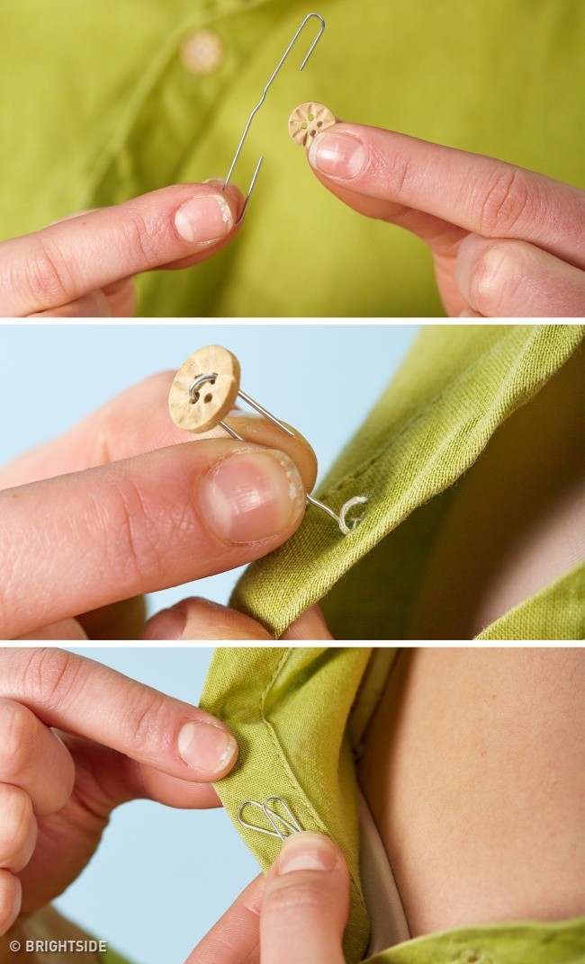 Cúc áo bạn đột ngột bị đứt mà bạn thì không có kim chỉ để khâu? Thật đơn giản, hãy dùng kẹp giấy luồn qua lỗ của chiếc cúc. Sau đó, xuyên phần kim loại còn thừa qua vết may của cúc, rồi gập lại để cố định cúc. Vậy là bạn lại tự tin giao tiếp mà không sợ “lộ hàng”.