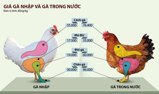 So sánh giá bán một số bộ phận của gà nội địa và gà ngoại nhập (ảnh: Tấn Đạt)