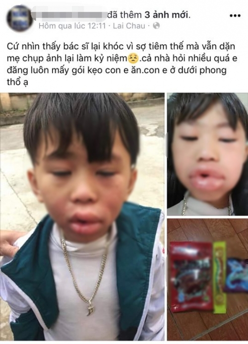 Chị Dương cho biết, con chị ở với bà ngoại ở huyện Phong Thổ, Lai Châu. Buổi sáng ngày 29/3 trước khi đi học cháu ăn sáng đầy đủ và không hề có biểu hiện gì. Trước khi đi học, con trai chị được bà ngoại cho 5.000 đồng, đến giờ ra chơi, cháu ra cổng trường mua kẹo ăn. Sau khi ăn được 3 phút thì miệng cháu bỏng rát và dần sưng to như trong ảnh.