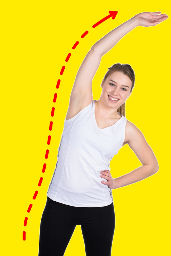 Đứng thẳng lưng, hai tay chống vào hông, chân rộng bằng một vai. Từ từ hít vào, giơ một tay lên cao, nghiêng người về phía đối diện hết sức có thể. Giữ trong 10 giây rồi thở ra nhẹ nhàng, trở về tư thế chuẩn bị. Lặp lại động tác 20 lần rồi đổi bên.