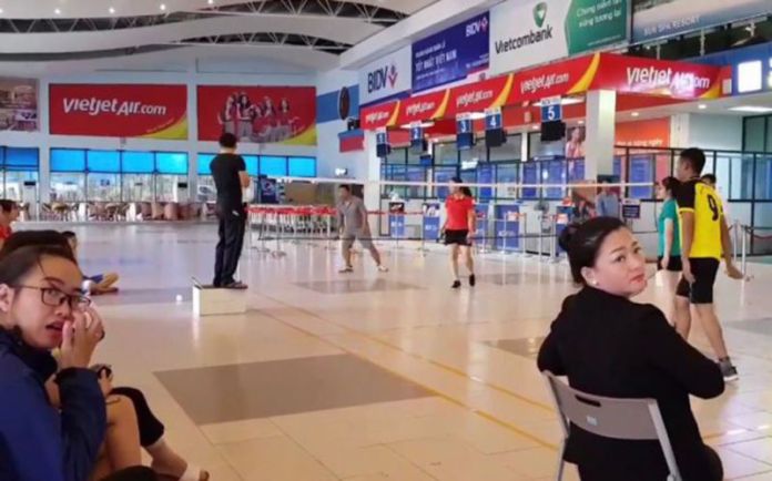 Khu vực nhà ga sân bay Đồng Hới đóng cửa để nhân viên chơi cầu lông. (Hình: Người Lao Động)