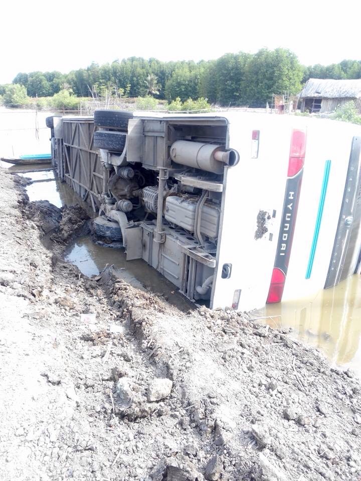 Khi đến địa phận xã Tân Ân Tây (huyện Ngọc Hiển, tỉnh Cà Mau), tài xế bất ngờ đánh lái để tránh xe cuốc đang thi công công trình trên đường. Cú đánh lái bất ngờ khiến chiếc xe chao đảo rồi lao xuống vuông tôm, lật nhào.