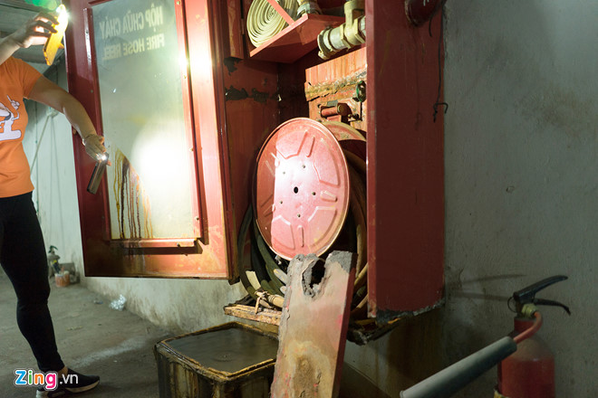 Kính hộp cứu hỏa vỡ, các thiết bị bên trong đều hoen gỉ. Ảnh: Thế Trung.
