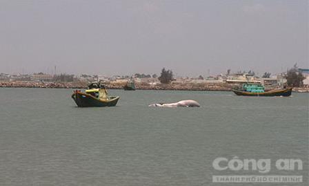 Lúc 6 giờ, ngày 3-4, tàu cá của anh Nguyễn Đỗ Hùng Tấn (29 tuổi), ngụ khu phố 8, phường Phú Trinh, TP.Phan Thiết (Bình Thuận) khi đang đánh bắt ngoài khơi cách bờ biển Phan Thiết khoảng 6 hải lý thì phát hiện xác một con cá voi (ngư dân gọi bằng cá Ông) trôi trên biển.
