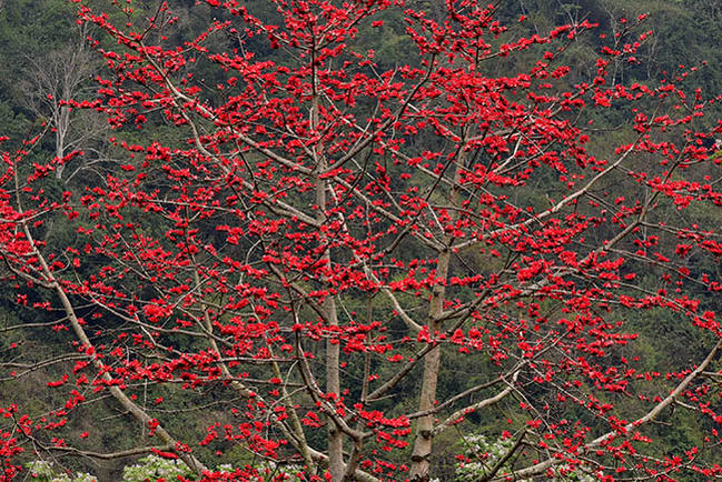 Cây gạo đỏ rực bên những ngọn núi cao sừng sững ở huyện Quản Bạ (Hà Giang). Vào đầu tháng 4, đi dọc quốc lộ 4B qua các huyện Yên Minh, Quản Bạ, Đồng Văn... hình ảnh hoa gạo nở bên lưng chừng núi đá xuất hiện rất nhiều.