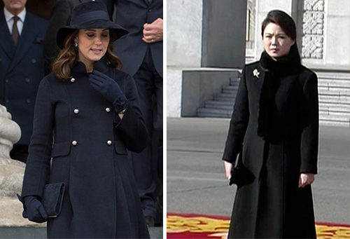 Chiếc áo dạ dáng dài trông tương tự nhau của công nương Anh và phu nhân lãnh đạo Triều Tiên. Ảnh: Splash News, AP