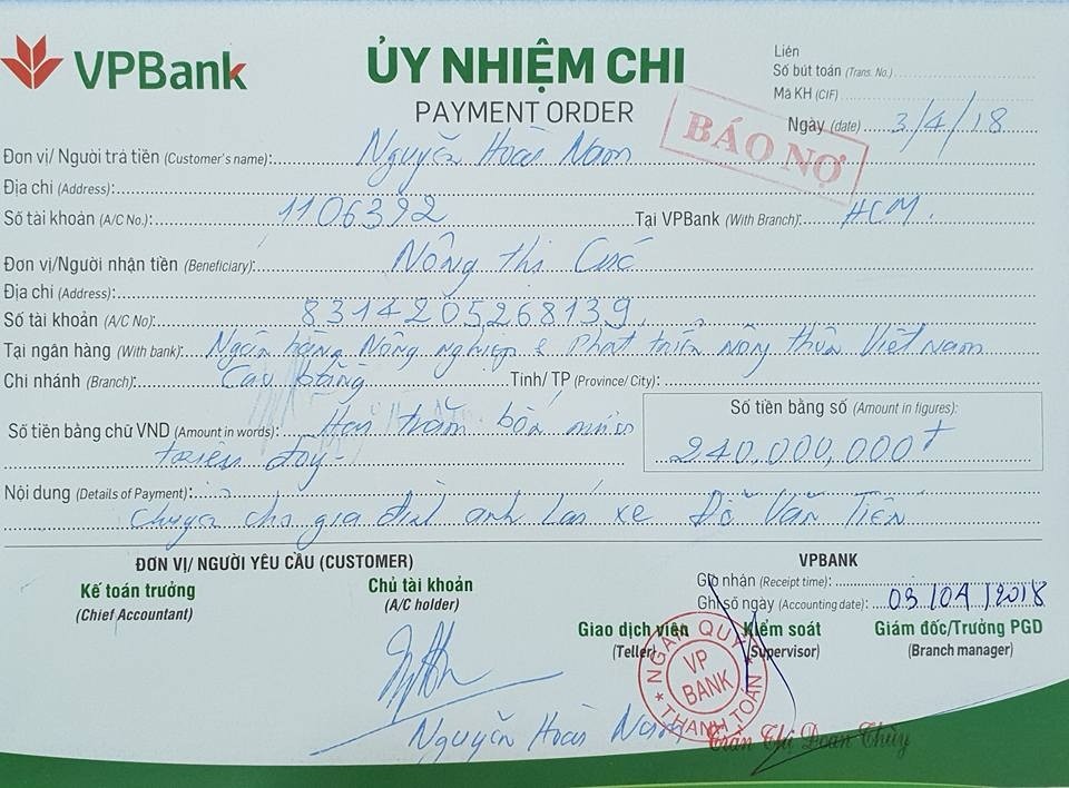 Câu chuyện này đang gây chú ý đặc biệt trong dư luận thì đến khoảng 18h ngày 3/4, trên trang cá nhân của mình, anh Nguyễn Hoài Nam đã đăng tải hình ảnh tờ giấy ủy nhiệm chi của ngân hàng, khẳng định anh đã chuyển 240 triệu đồng cho vợ tài xế Tiến.