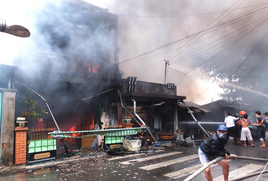 Người dân hô hoán kéo vòi nước cùng nhau dập đám cháy nhưng bất thành. Lửa lan nhanh sang hai căn nhà bán dừa khô rồi cháy thêm nhiều căn khác. Mọi người nháo nhào đẩy nhiều xe máy, đồ đạc ra ngoài.