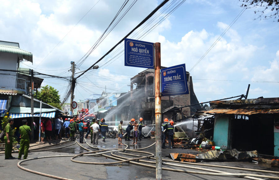 Vụ cháy xảy ra ở đường Trưng Trắc, Mỹ Tho, Tiền Giang (ảnh: thanhnien)