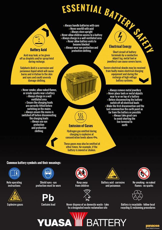 Tất cả các loại pin, ắc quy tại Anh đều phải dán để khuyến cáo người dùng về mức độ nguy hại của chúng (ảnh: yuasa.co.uk)