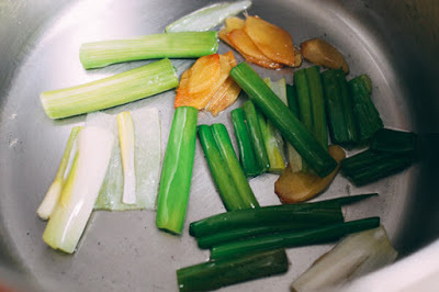 - Đặt nồi trên lửa trung bình (medium low heat), cho dầu và gừng vào. Xào gừng trong khoảng 30 giây.
