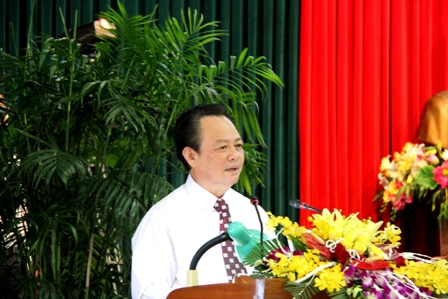 Ông Văn Hữu Chiến (ở giữa) nhận hoa chúc mừng trúng cử Chủ tịch Đà Nẵng của ông Nguyễn Bá Thanh và Trần Văn Minh. Ảnh: Đình Thiên