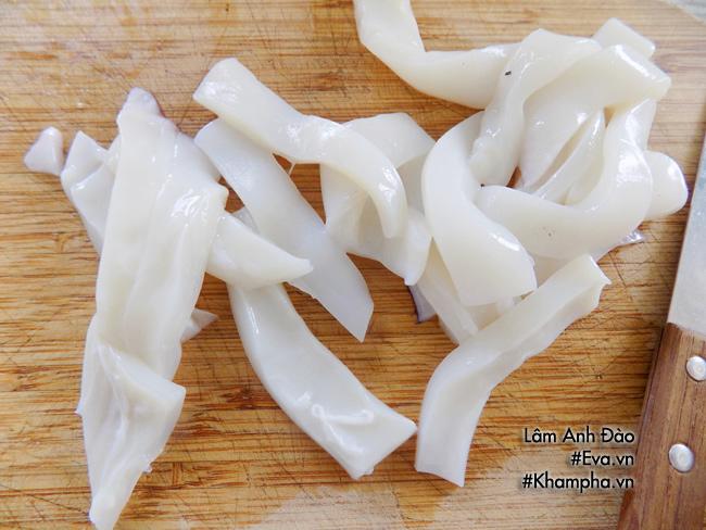 Bước 2: Mực rửa sạch thấm khô, thái miếng hơi to và dài cỡ ngón tay áp út.